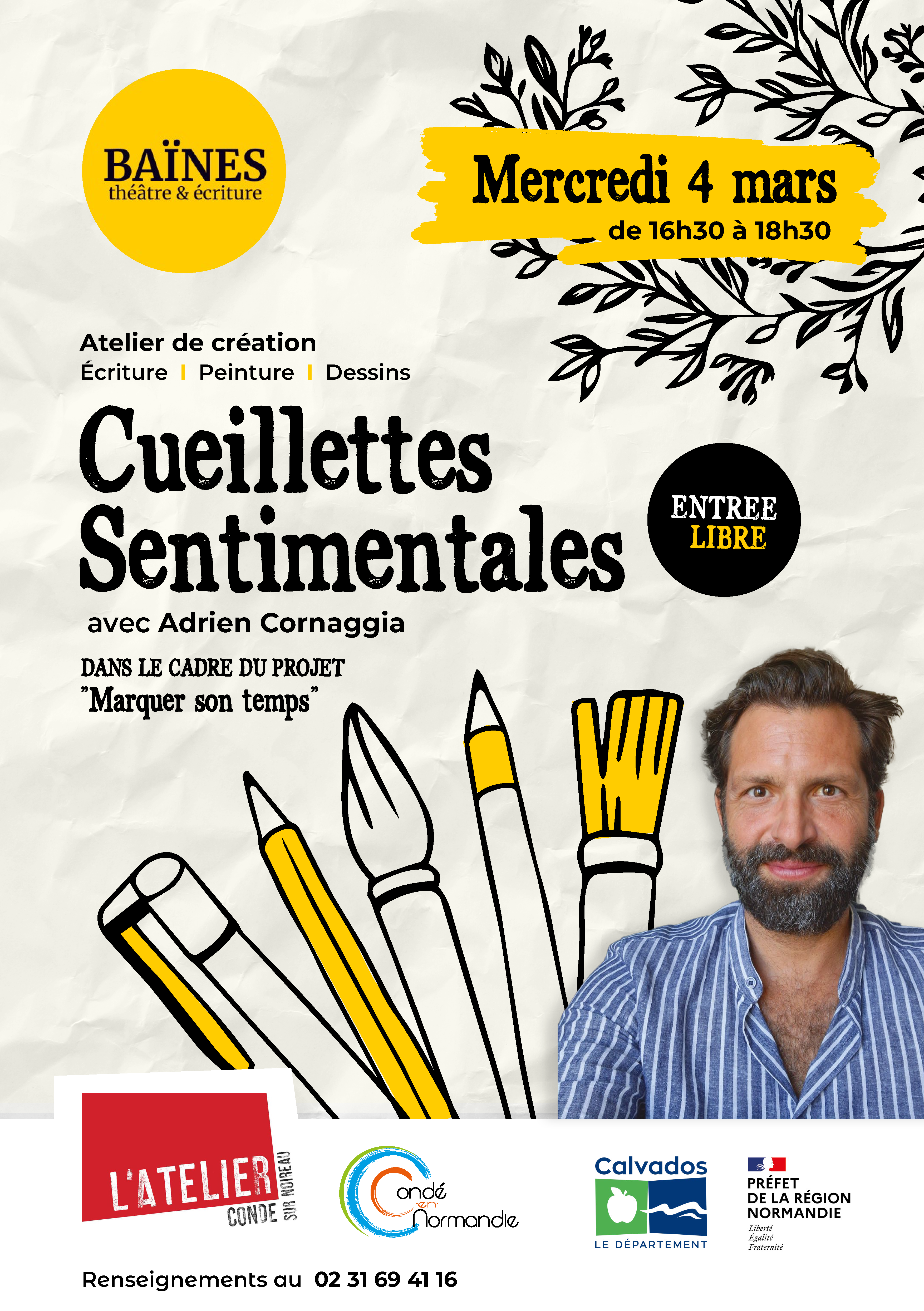 Atelier de création (peinture, écriture, dessin) avec l’artiste dans le cadre du projet participatif “Marquer son temps”. De 16h30 à 18h30.